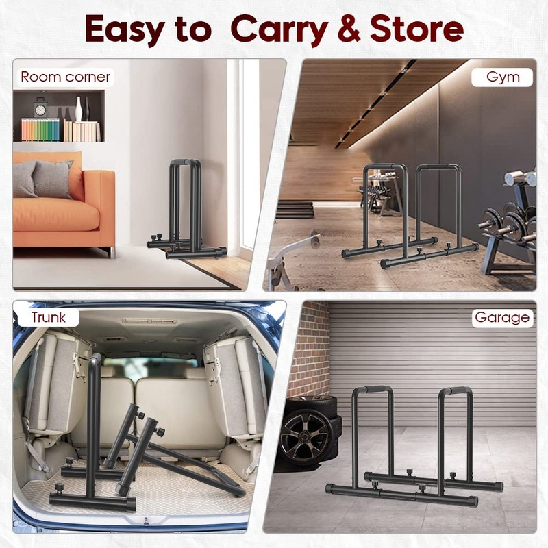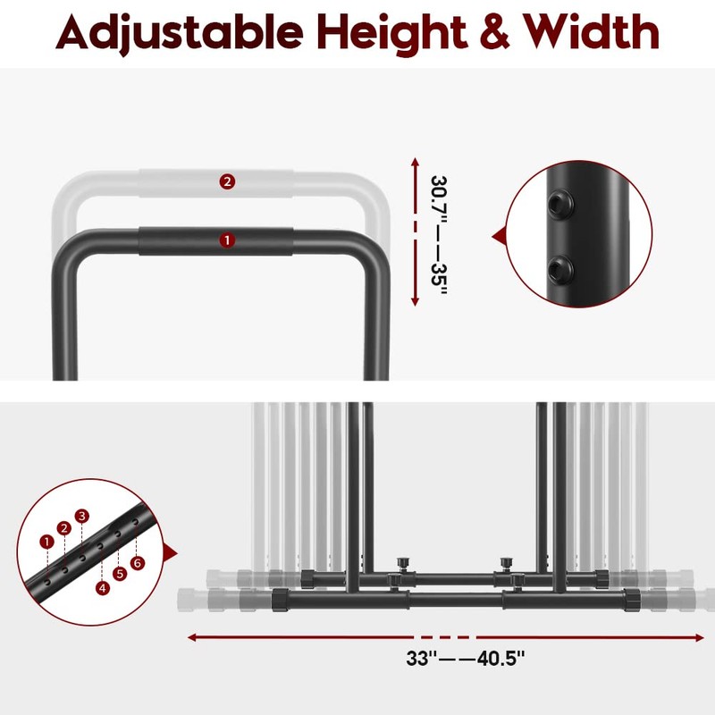 - ADJUSTABLE HEIGHT and WIDTH-- As an adjustable dip station, its width is 35''- 41'' inch, its height is 30.7''- 35.43'' inch. Carrying out to sustain or improve health and fitness, you can adjust it to suit your needs for various types of exercise.
