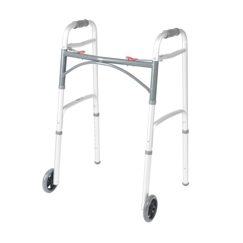 Drive Medical 10210-1 2-Button Folding Walker with Wheels, Rolling Walker, Front Wheel Walker, Lightweight Walkers for Seniors and Adults Weighing Up To 350 Pounds, Adjustable Height, Silver