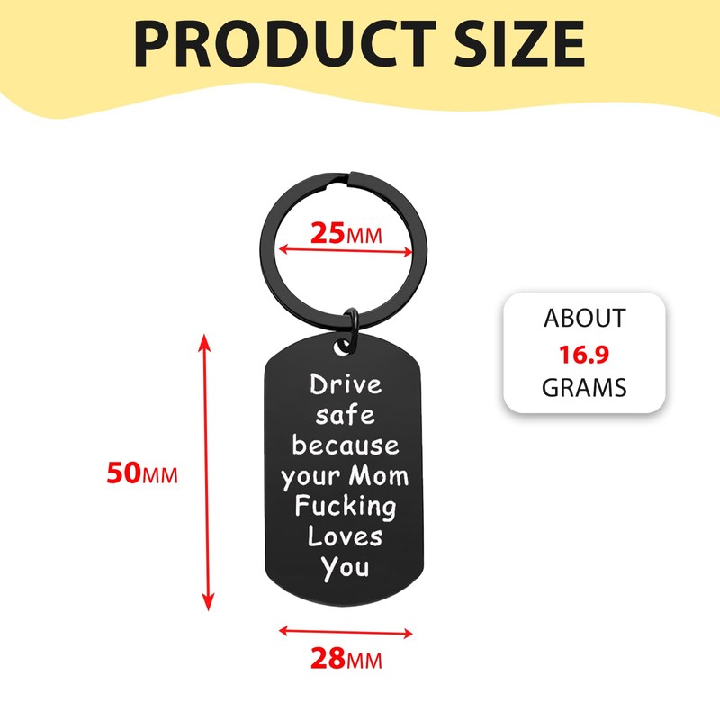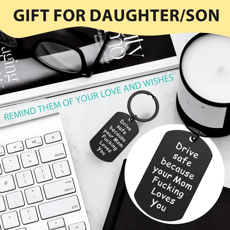 - Drive Safe Keychain for Daughter/Son: This keychain features a humorous message that reads, "Drive safe because your Mom fucking loves you." It adds a touch of fun and humor to the keychain, making it a memorable and entertaining present . It's a great way to show your love and concern while bringing a smile to their face