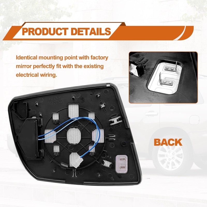 - 【EASY INSTALLATION】Identical mounting point with factory mirror, fit with the existing electrical wiring perfectly. Wiring harness must be unplugged from existing backing plate and plugged into the new backing plate before installation.