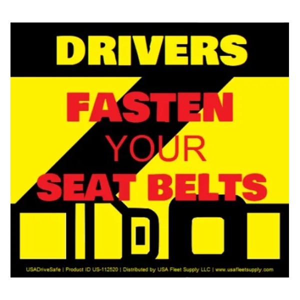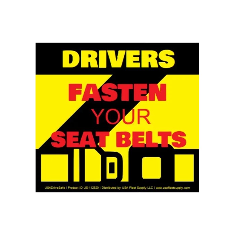 This 5" x 3" Drivers Fasten Your Seat Belts Decal is printed on premium 4mil exterior grade vinyl with adhesive backing. This durable vinyl decal is weatherproof with bright, highly visible outline and text that is coated by a glossy UV protecting clear finish to prevent fading over time.