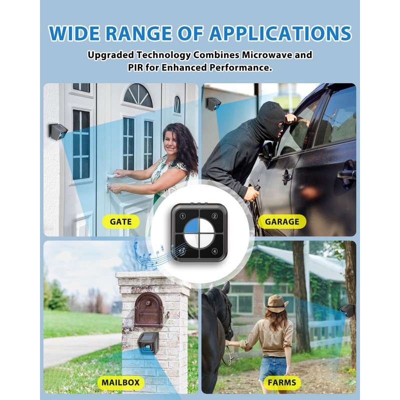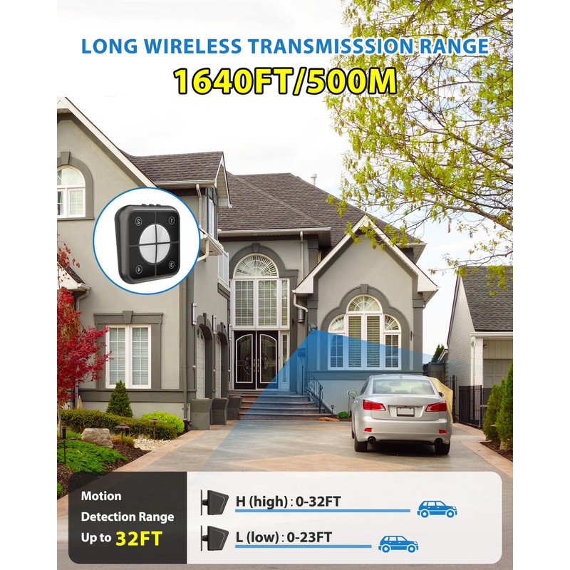 - Long Range Wireless Coverage: Enjoy up to 1640FT (500M) communication range from each sensor to the receiver, ideal for large areas. Detect cars, people, and animals within 13ft to 32ft. Perfect for protecting both outdoor and indoor properties