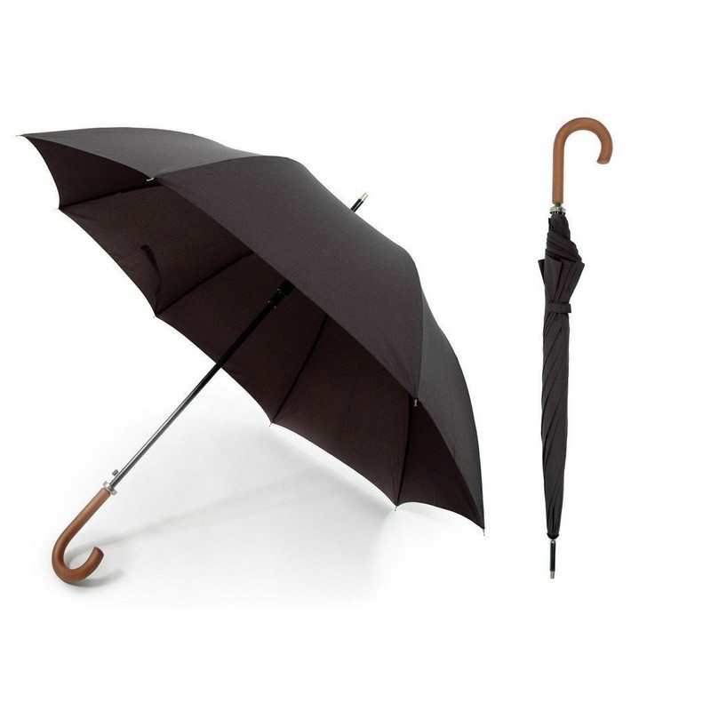 Drizzles Mens Long Auto Umbrella with a Wooden Crook Handle (Plain Black)
