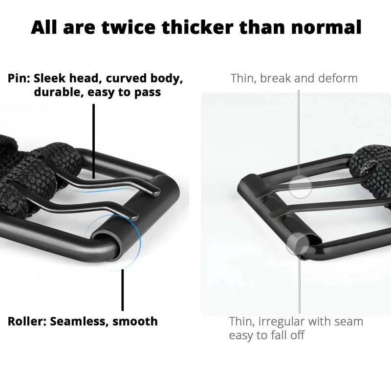 Indestructible quality solid buckle. The prong and buckles are specially thickened, and its double holes row design helps to keep the pants very secure. You can use it every day to hold up your pants.