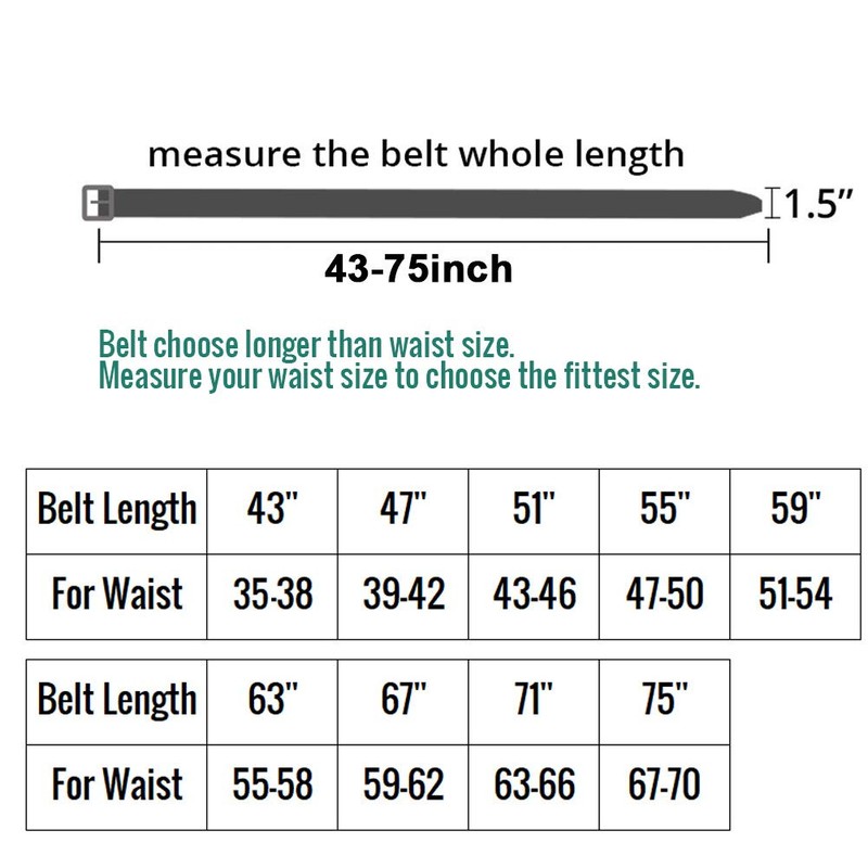 - Size recommendation: Belt length is chosen longer than waist size. [43'': for waist 35-38] [47'': for waist 39-42] [51'': for waist 43-46] [55'': for waist 47-50] [59'': for waist 51-54] [63'': for waist 55-58] [67'': for waist 59 -62] [71'': for waist 63-66] [75'': for waist 67-70]