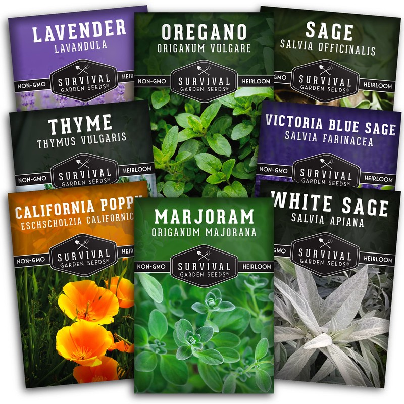 - 8 Useful Plants - Lavender, Blue Sage, California Poppy, Thyme, White Sage, Marjoram, Culinary Sage, and Oregano are easy to grow and have numerous uses in the survival homestead. This mixed pack of seeds includes edible herbs, ornamental flowers, medicinal plants, and wildflowers.