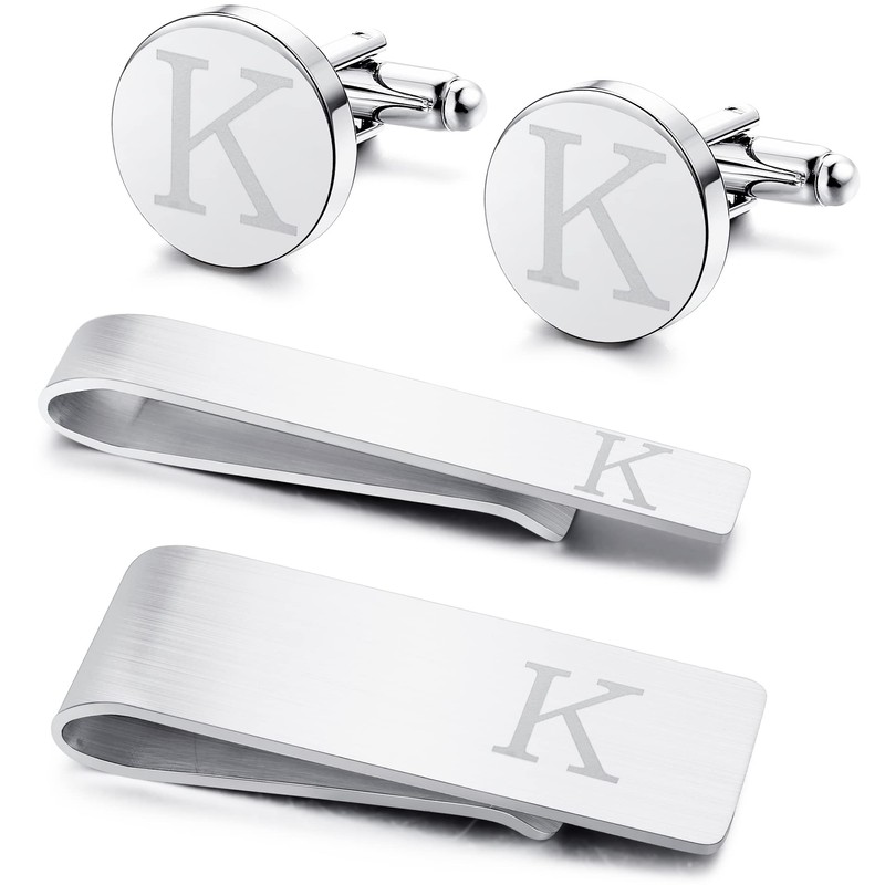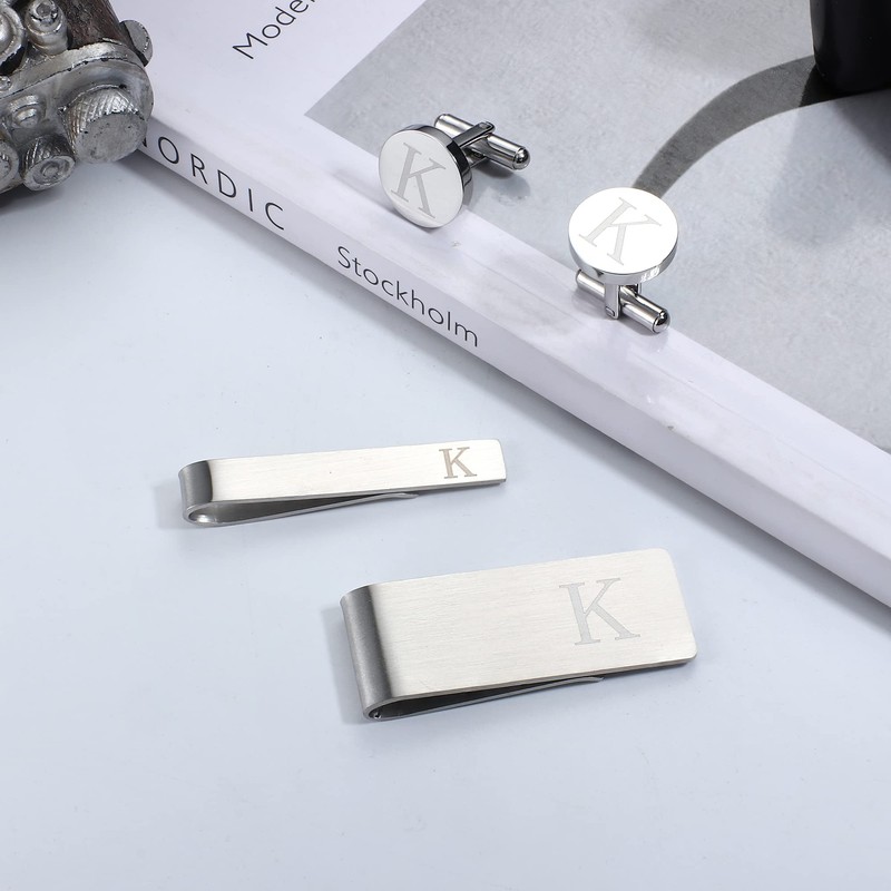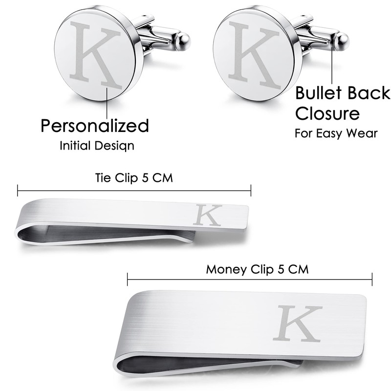 - 【Cufflinks and Tie Clips Set for Men】-One Order Include 1Pairs Engraved Initial Cufflinks,1 Pcs Tie Clips, and 1 Pcs Money Clip.Personalized Design Allows You to Choose Letter A-Z Matching According to Your Name. Classic and Elegant. Easy to Match Your Shirts and Other Formal Clothes.It Can Help You Gain More Confidence in Business Occasions.