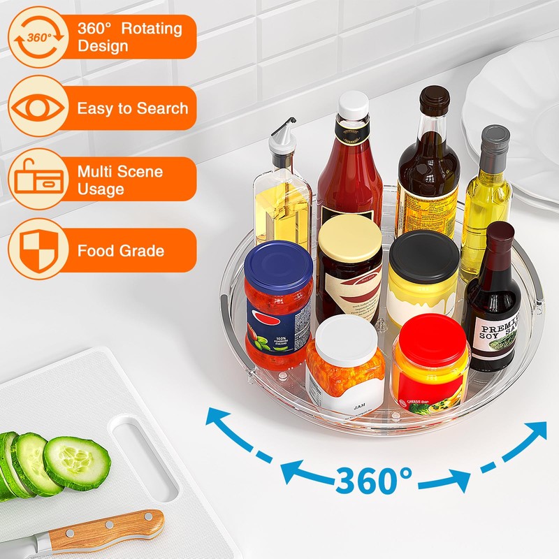 - 360° rotation and clear: the turntable organiser rotates continuously 360° in a circle for easy access to spices, cans, ingredients, etc. The visible transparent plastic makes it easy to see what the organiser contains without fumbling around or rummaging around.