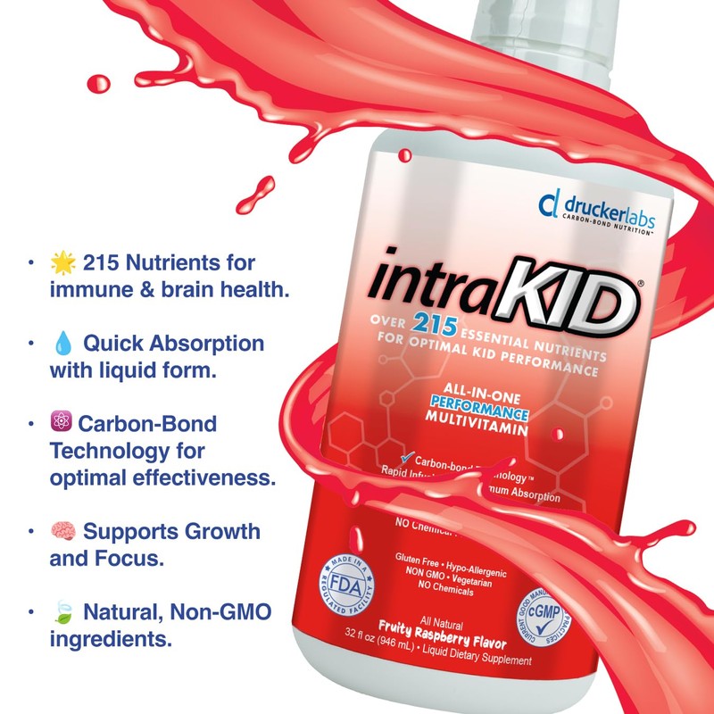 - COMPREHENSIVE MULTIVITAMIN SUPPLEMENT FOR CHILDREN: Drucker Labs intraKID 2.0's potent and recently improved all-in-one formula contains over 215 essential ingredients including vitamins, antioxidants, fibers, Omega 3, 6, and 9, probiotics, amino acids, herbs, proteins, and much more! IntraKID 2.0 is a 100% carbon-bond, organic, micro-complex, and plant-sourced supplement that is perfectly balanced for kids' nutrition.