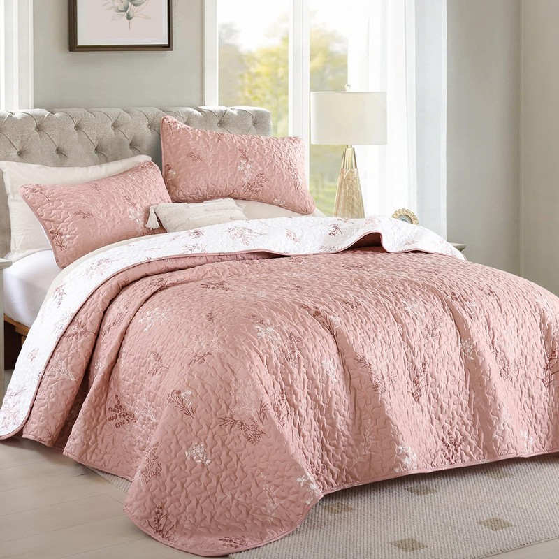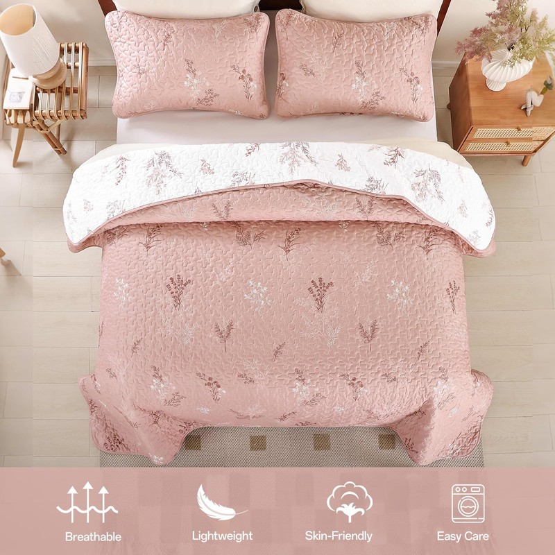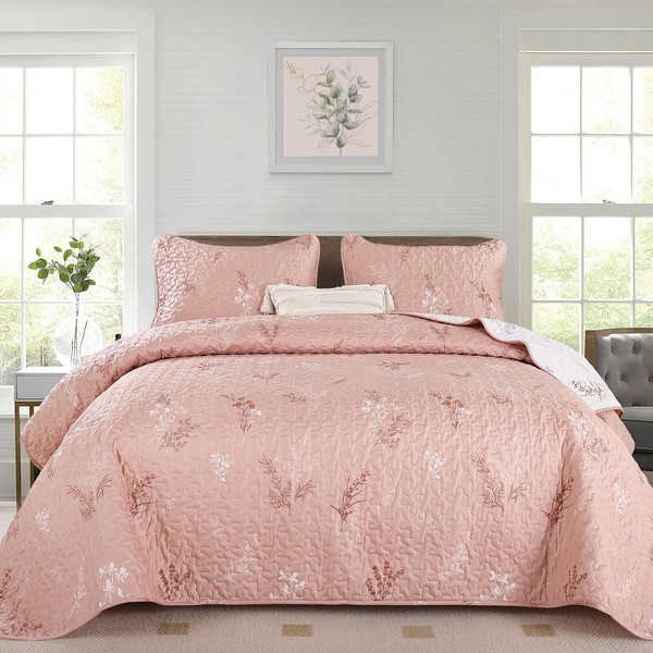 Drucon Pink Quilt King Size 3 Pieces Branch Botanical Quilt Reversible Microfiber Bedspreads with Floral Pattern Lightweight Bedding Set with 2 Pillow Cases