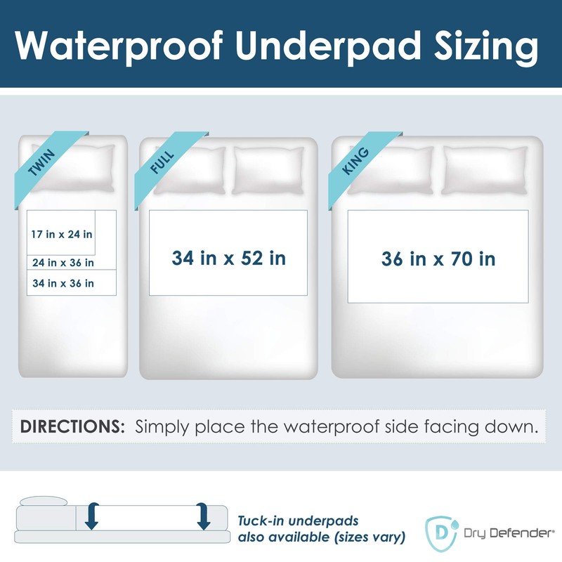 - The Right Size For You - Available in a range of sizes to best suit your needs, Dry Defender's washable underpads provide maximum protection. No matter what age, our reusable bed pad waterproof materials are designed to absorb quickly and lock in moisture for the best protection and comfort available.