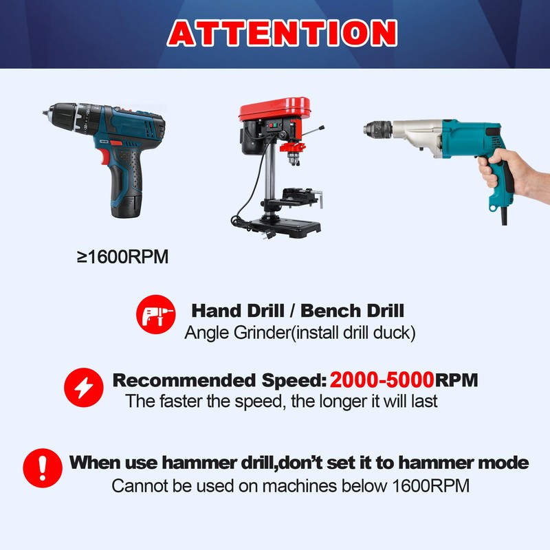 • Machine --Suitable for any electric drill,hand drill,Bench Drill,Recomend RPM:6000,MIN RPM≥2000, When use Angle Grinder,please install angle grinder drill chuck