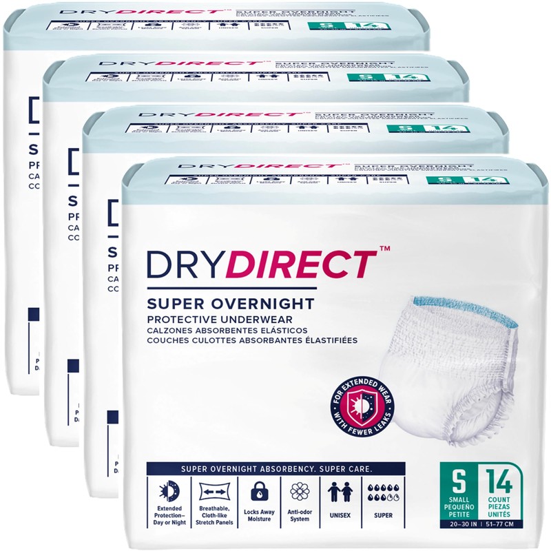Dry Direct Super Overnight Underwear, Soft Cloth-Like Adult Diapers, Overnight Disposable Incontinence Protection - Small (Case of 56)