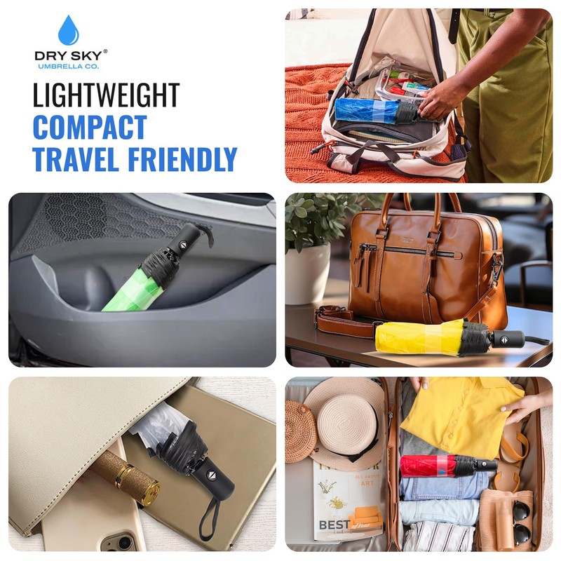 Dry Sky Umbrella Co. Clear, Windproof Travel Umbrella for Rain - One-Click Auto Open and Close, Durable & Compact Umbrella, Strong Fiberglass Frame, Waterproof Canopy - Backpack, Purse, Portable Umbrella for Travel (Green)