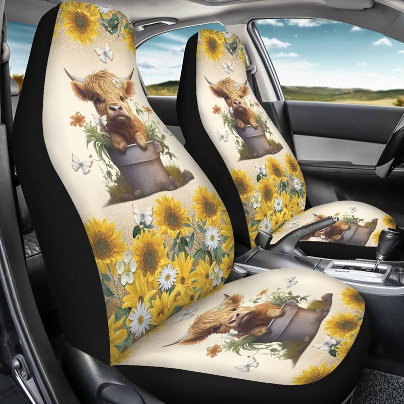 Drydeepin Yellow Sunflower Highland Cow Cattle Car Seat Covers Set of 2 Retro Daisy Flower Butterfly Print Car Accessories Auto Interior Decor Bucket Seat Covers Universal Fit Trucks SUV Van
