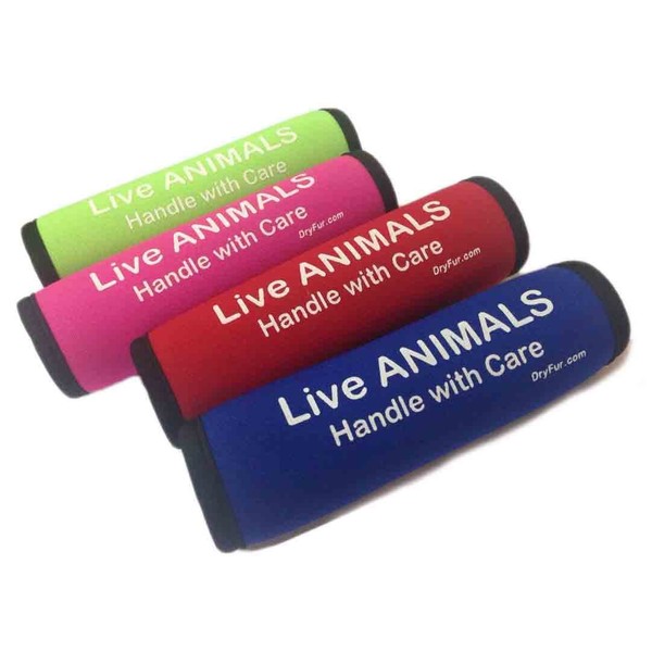 FEATURES: 5" x 5" Neoprene material Sold in Set of 2 Bright Fluorescent Neon Colors Adds comfort to handles and straps Available in Blue, Green, Pink, Red Perfect for Pet Carriers, Kennels and Luggage Cautions Airline personnel to handle with care Reversible design change from Live Animals to Blank to use on luggage Handy Luggage and Pet Carrier-Kennel Identifier Add comfort to soft carry-on pet carriers. Also Brings attention to your hard sided kennel by adding a brightly NEON colored Comfort Grip to the handle. Easily seen from airplane window helps you spot and watch your pet being loading into the area of the plane. Available in Neon Hot Pink, Neon Red, Neon Blue and Neon Green. Reads Live Animals - Handle with Care Adds comfort to any handle grip including pet kennels, soft pet carrier bags and is reversible so can also be used on luggage. Making luggage easy to identify and claim at baggage claim area. SOLD IN SET of 2