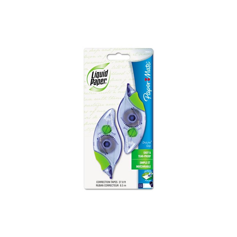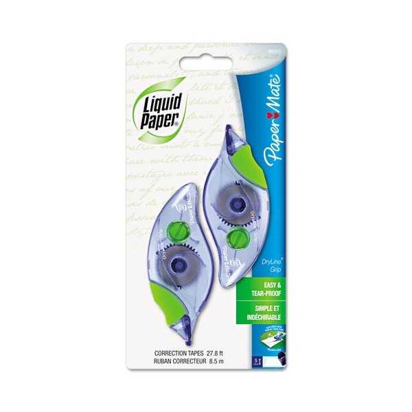 Paper Mate Liquid Paper DryLine Grip Correction Tape lays down smoothly and corrects instantly--no drying necessary. Ideal for correcting single or multiple lines, this strong polymer-back tape quickly fixes mistakes without making a mess. This correction tape resists breakage and tearing, allowing you to neatly correct long passages of text. It also applies dry, so you can copy, fax, edit, or type immediately after application. Line Coverage: 1; Tape Width: 1/5"; Tape Length: 335"; Case Color(s): Gray/Green.
