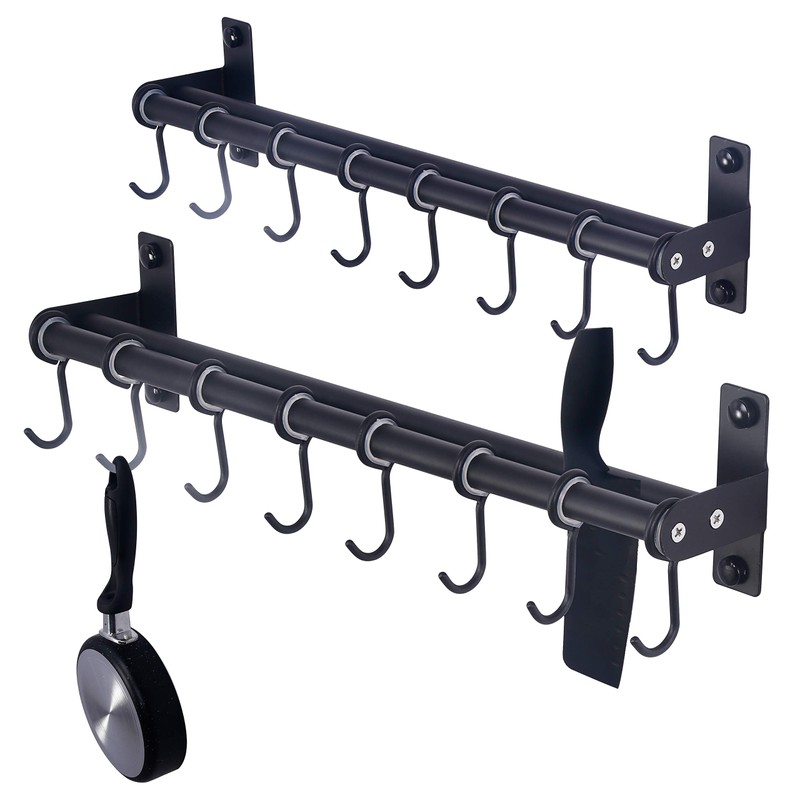 **Dseap Hanging Pot and Pans Rack with 8 Hooks, Double Bars, Pot Rack Wall Mounted** Material: Stainless steel Color: black **Dimension:** Sizes in inches: 15-3/4 L x 3-3/8 H x 1-5/8 Deep. **Package Includes:** 2* Dseap Pot Hangers **Application Scope:** Perfect utensil holder, wall hanger for hanging pots and pans, towel and other cooking utensils in kitchen, as well as the coffee mug, cups, bathroom towel, jewelry, bags, keys, plants and more.