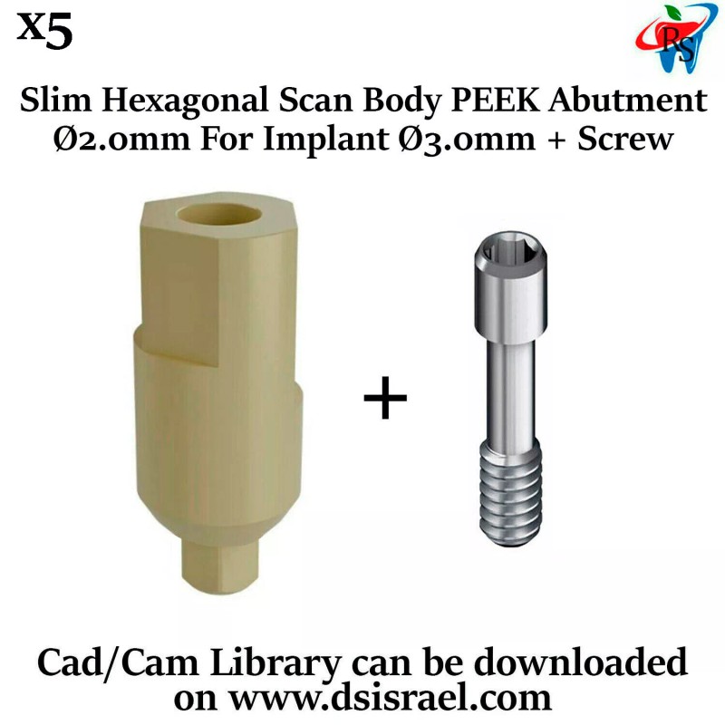 DSI 5x Dental Implant Cad/Cam Slim PEEK Post Scan Abutment Digital Library Ø2.0mm