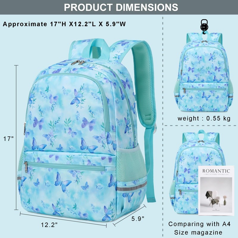 DSIUE Kids Backpack for Girls Elementary BookBags Teens Middle School Backpack with Lunch Box (Butterfly Green)