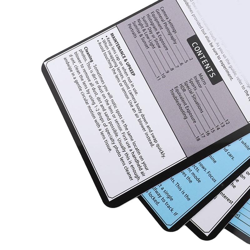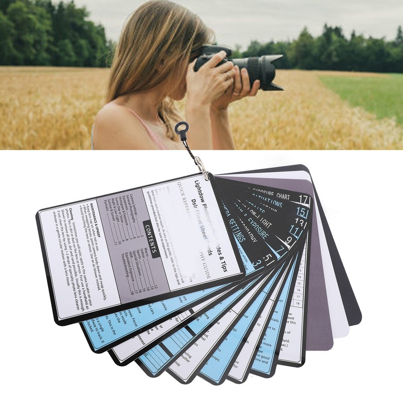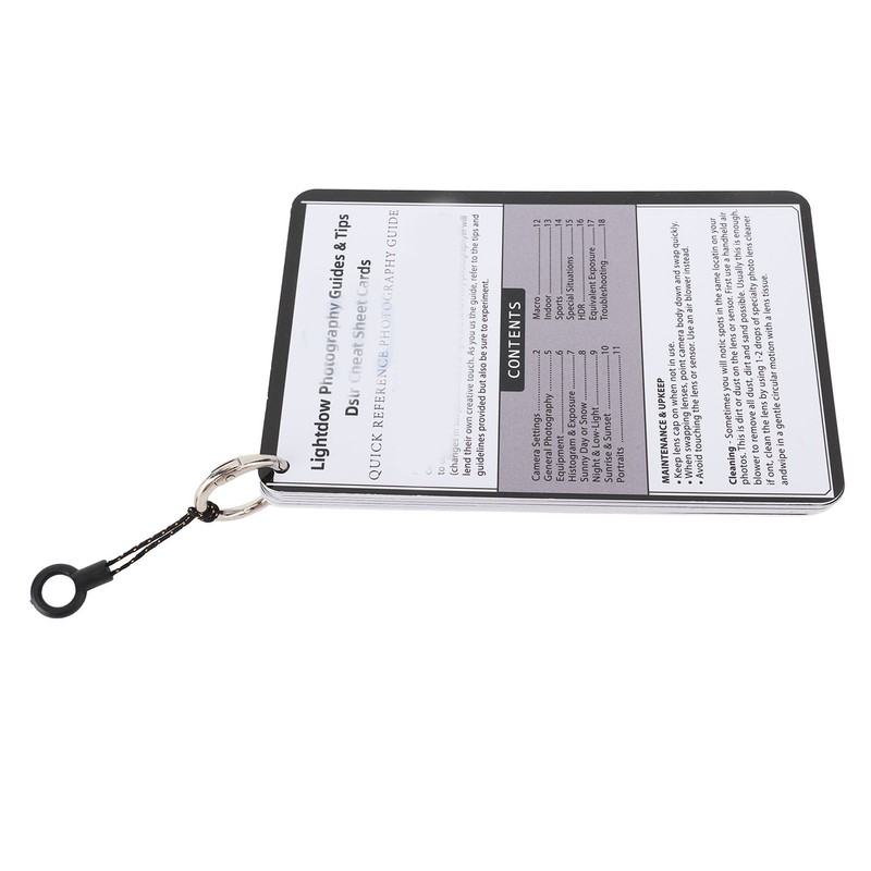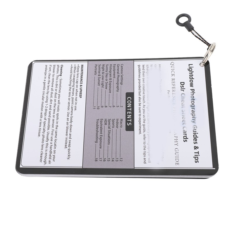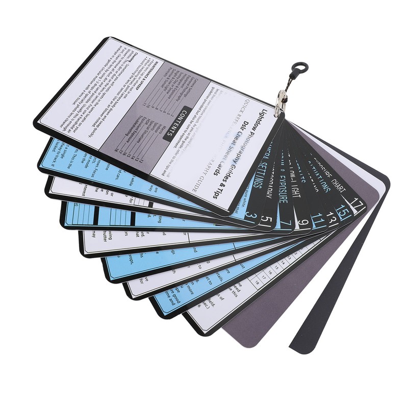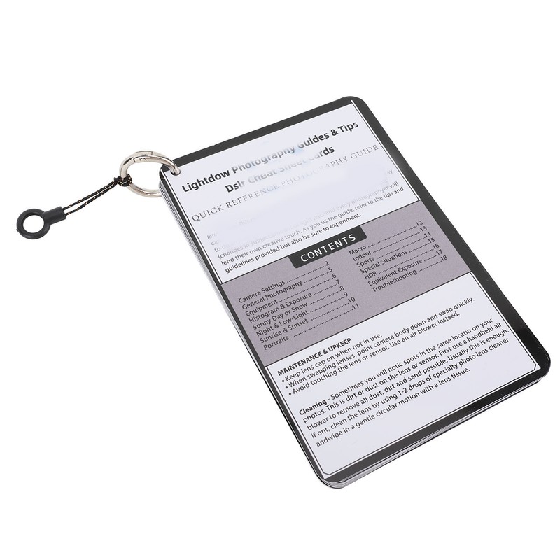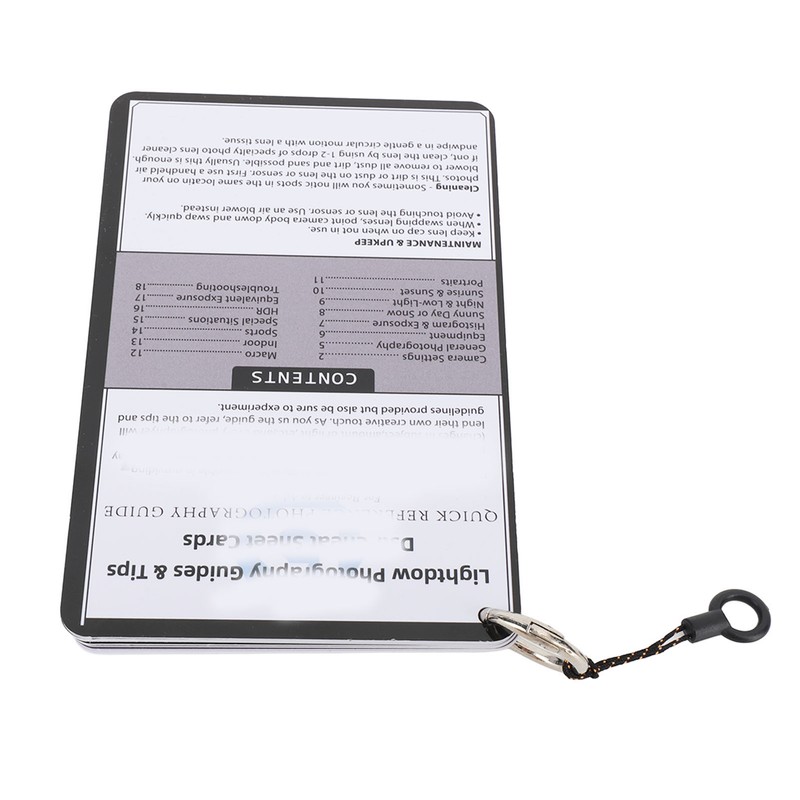 1、Pocket Sized: Durable cards covering exposure, aperture, shutter speed, and other common photography concepts. Compatible with any digital SLR, DSLR, or mirrorless camera models, providing clear camera settings and technical explanations. 2、Practical Solution for Beginners: Enables beginners to gain confidence and improve photography skills without the need for extensive manuals or courses, offering a practical solution for those new to the complexities of digital photography. 3、Weatherproof and Tear Resistant Design: Ensures these convenient reference cards can withstand the rigors of outdoor shooting. 4、4x6 Inch Cheat Sheet Cards: Includes 18 pages of concise and understandable tips, accompanied by intuitive examples, covering various shooting scenarios. A valuable tool for photographers in different environments and lighting conditions. 5、Neutral Density Card: Suitable for more advanced photographers, simplifying the complexities of exposure and color correction when working in different lighting conditions. Beneficial when working under pressure at events like weddings or fashion shows.
