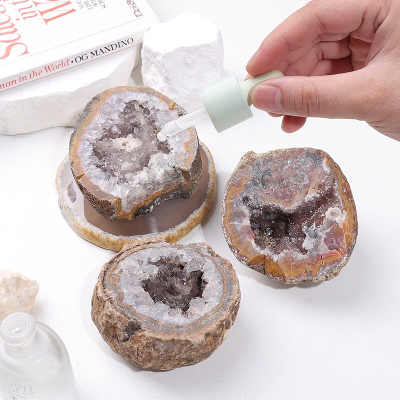 - GEODE AGAT STONE FOR HOME DECOR The Agat stone is an eye-catching home decor item and a sought-after mineral piece, perfect for home and office. Whether as a decoration or collectible, it brings happiness and balance to people. In addition, its porous structure allows the absorption and slow release of essential oils, creating a soothing and aromatic atmosphere in the surrounding room.