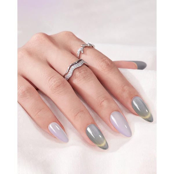 Dsvanay Almond Press On Nails Medium - Purple French Cat's Eye False Nails with Golden Glitter Galaxy,Glue On Nails with Jelly Glue, Reusable 12 Sizes - 24 Soft Gel Fake Nails Kit, Glitter
