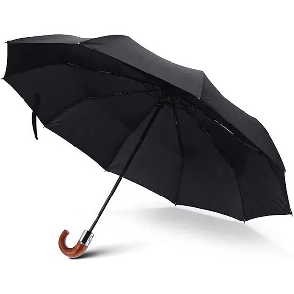 DSWINCE Curved Handle Umbrella Windproof, Automatic Open Umbrella for Men Imitation Wooden Handle Travel Folding Umbrella Portable Black Rain Umbrella Auto Mens Sunny Umbrella (Black)