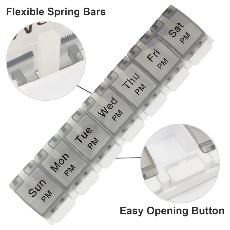 - 【Easy to Open for Arthritis Sufferers】This pill box can be easily opened with the push of a button, ideal for children and the elderly. The tablet organiser also has a good seal, which can effectively prevent moisture and spoilage of the tablets.