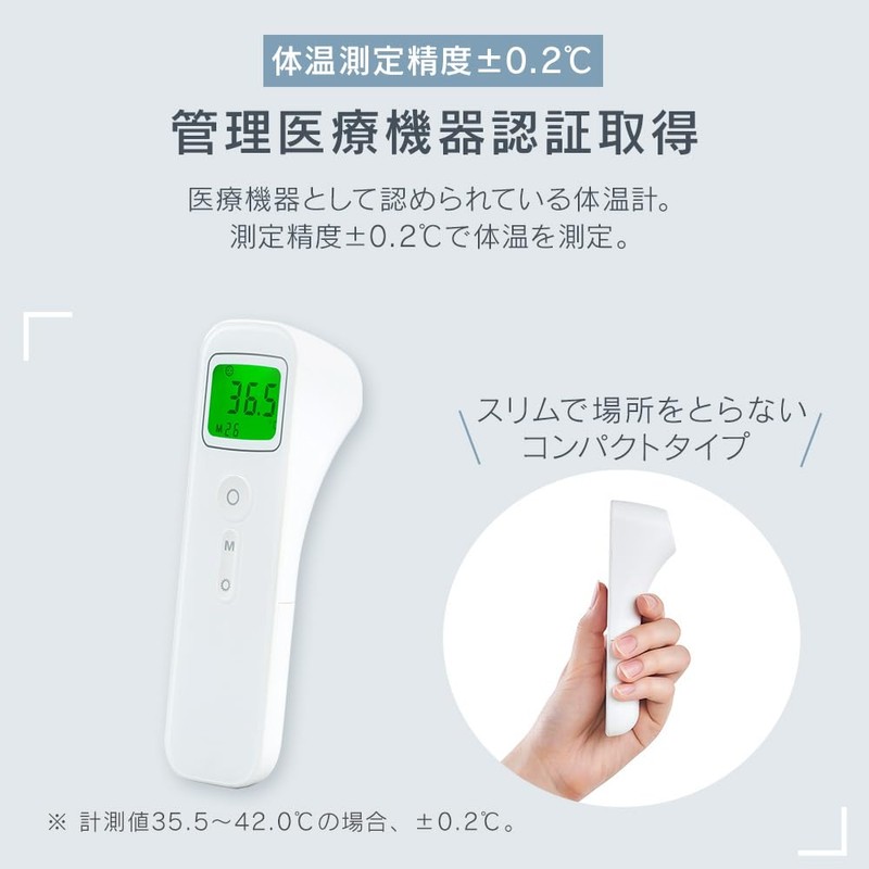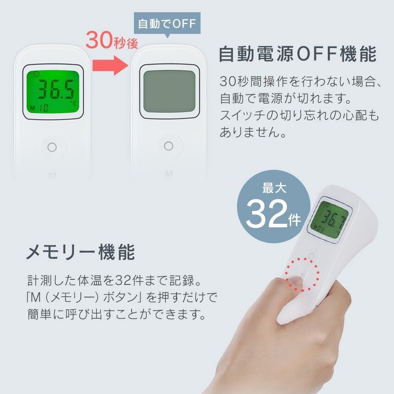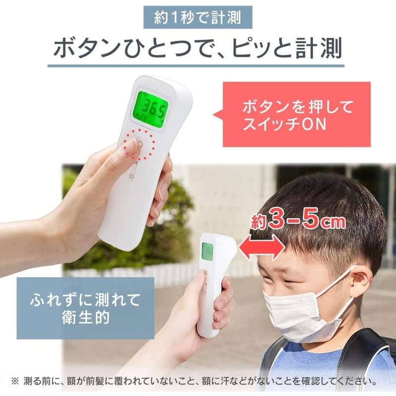 - ・商品サイズ(cm):幅約4×奥行約4×高さ約14●質量:約66g(電池含まず)●体温測定場所:額●測定距離:3~5m