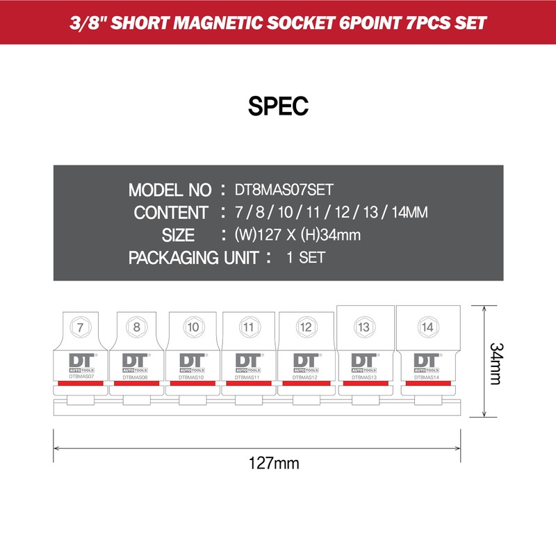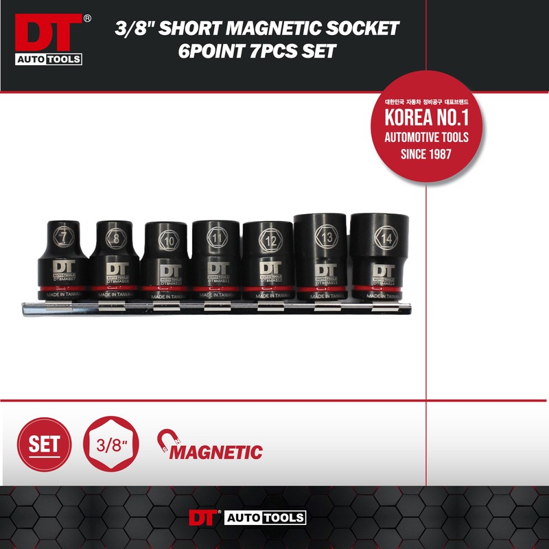 DT Auto Tools 3/8-inch Short Magnetic Socket Set, 6-Point, 7-14mm, 7 Pieces