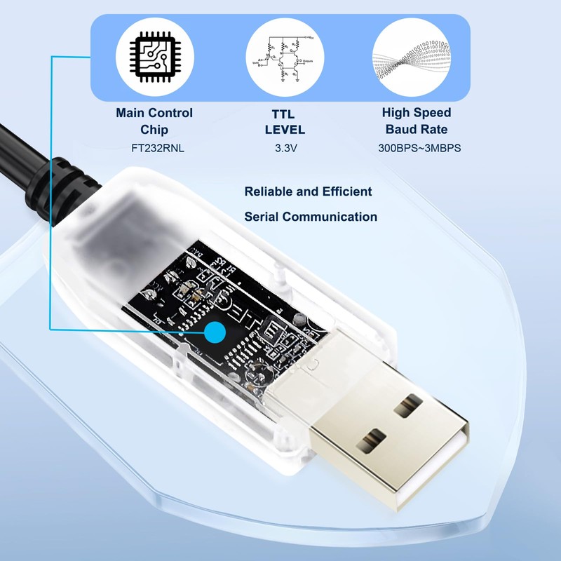 - Built with FTDI chip USB to TTL serial adapter 6ft features FT232RNL chip and flashing LED indicators of TX and RX, easy monitoring on data flow of 3.3V logic level UART signal interface, provides reliable communication and efficient data transfer