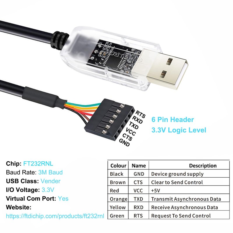 - short USB serial adapter TTL level compatible with Windows 11, 10, 8, 7 (32/64-bit), 2008, XP, Mac OS, Linux (6 way plug adaptor is built with original FTDI FT232RNL IC module, if driver not auto installed, it can be downloaded on the FTDIwebsite)