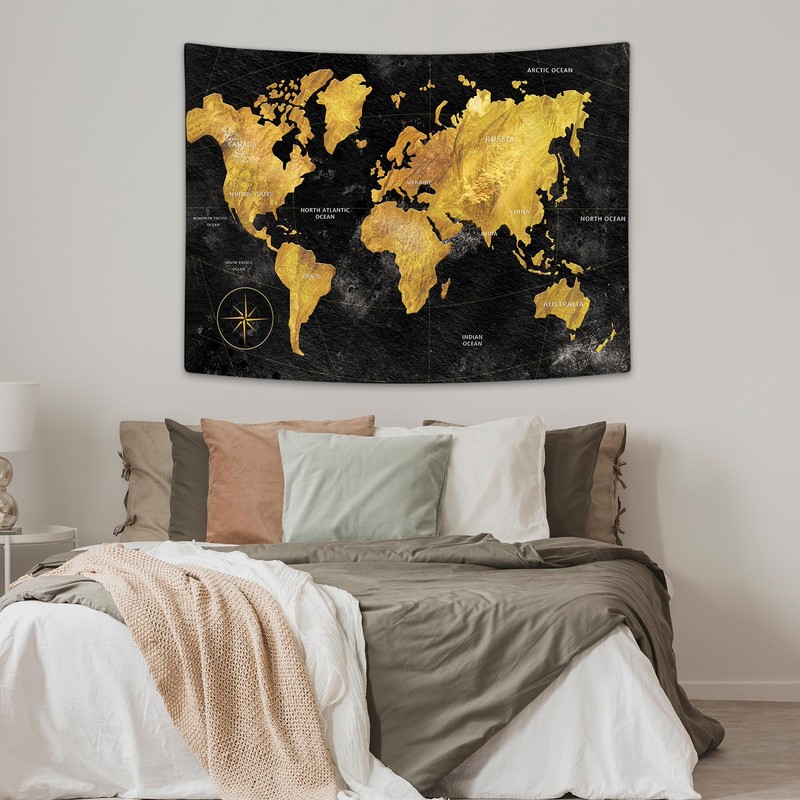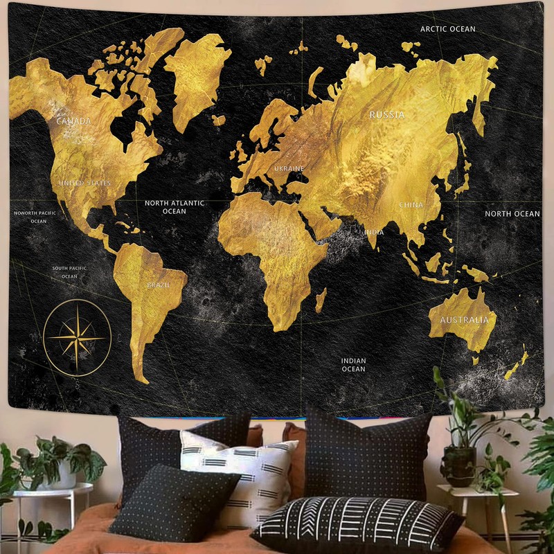 Dtekoj World Geographical Distribution Tapestry, Black and Gold World Map, 90 X 70 IN Panels for Bedroom, Living Room, Dorm
