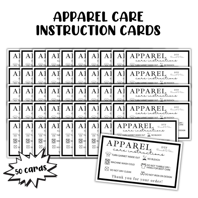 DTF Direct To Film Apparel Care Instruction Washing Cards 50pk 2x3.5” Customer Thank You Cleaning Sweatshirt T-Shirt Custom Decal Applique Printer