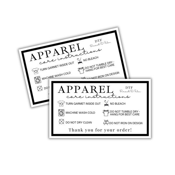 DTF Direct To Film Apparel Care Instruction Washing Cards 50pk 2x3.5” Customer Thank You Cleaning Sweatshirt T-Shirt Custom Decal Applique Printer