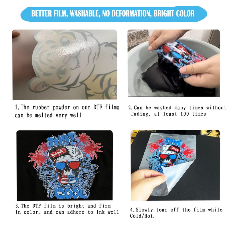 - No Pretreat:One of the biggest benefits of dtf film does not have to be pretreated, which saves you time and money. You can print on T shirts,Hats,Shorts/pants,Bags,Flags/Banners,Koozies,Any other fabric items.