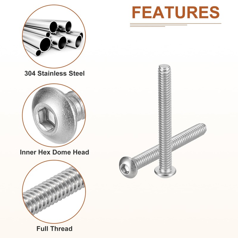 - [Design]: The button socket head cap screw is designed with an inner hex drive style and dome head, providing a higher torque and clamping force, as well as offering a wider bearing surface and high tensile strength.