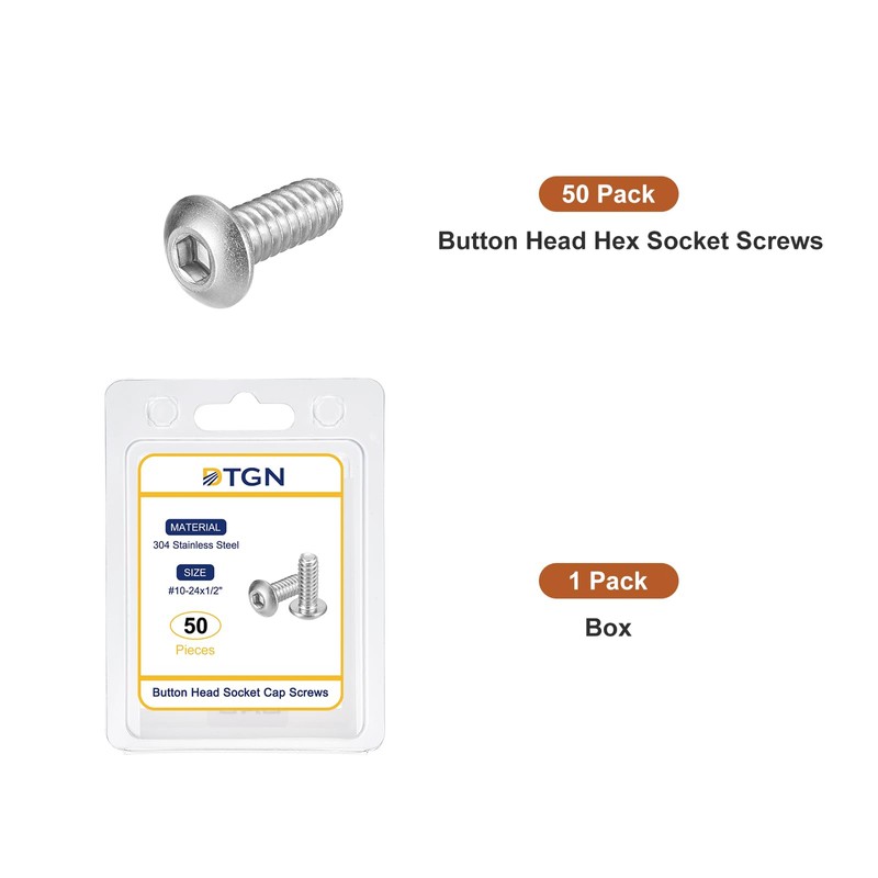 DTGN #10-24x1/2 Button Head Socket Cap Screws - 50Pack - Good for Machine - 304 Stainless Steel 18/8 - Hex Drive Full Thread UNC Fasteners