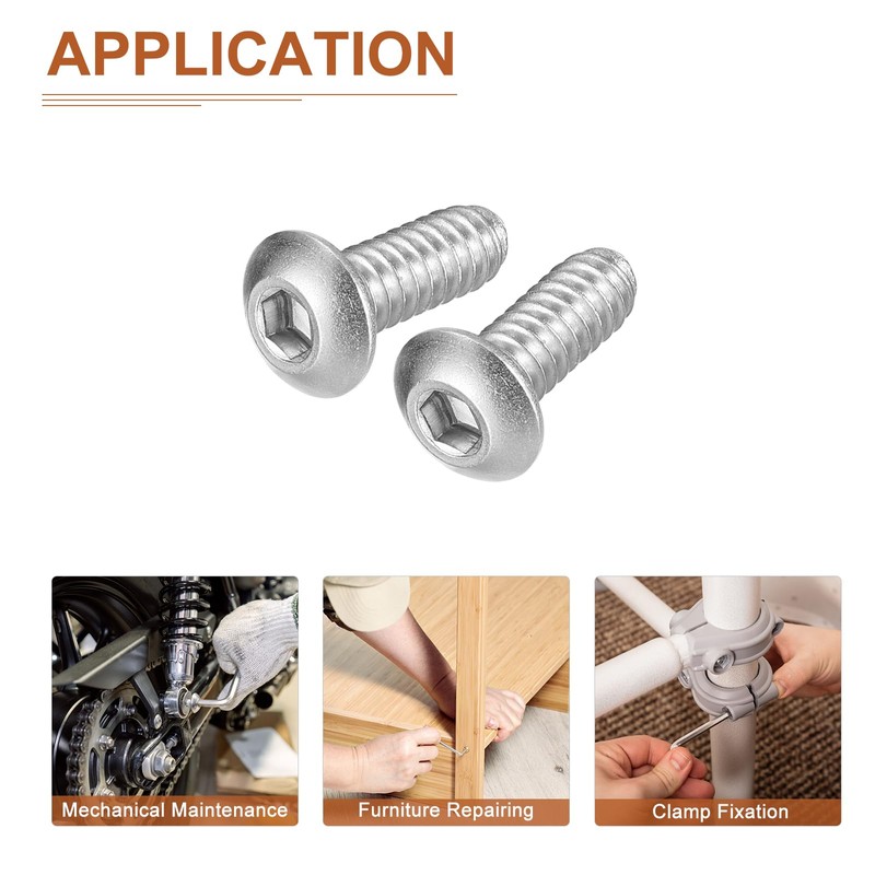 - [Design]: The button socket head cap screw is designed with an inner hex drive style and dome head, providing a higher torque and clamping force, as well as offering a wider bearing surface and high tensile strength.