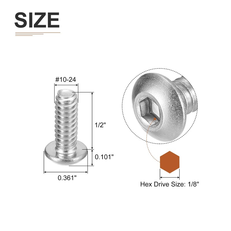 - [Inner Hex Socket Screw]: The package comes with 50 Pcs of full thread UNC button head socket screws in Thread Dia: 0.19inch, Number of Teeth: 24, Thread Length: 1/2inch, Head Dia.: 0.361inch, Head Thickness: 0.101inch