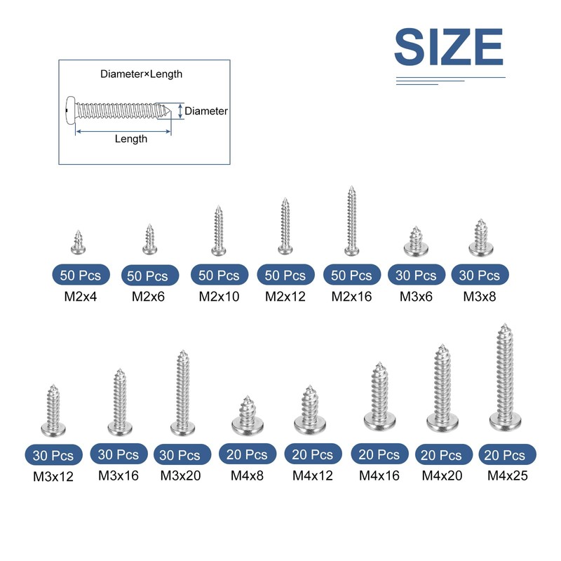 - 【SELF-TAPPING SCREWS】The package comes with 500 304 Stainless Steel,Washed Silver Pan Head Cross Self-Tapping Screws.Size:M2x4,M2x6,M2x10,M2x12,M2x16,M3x6,M3x8,M3x12,M3x16,M3x20,M4x8,M4x12,M4x16,M4x20,M4x25.A total of 15 products, 500 self-tapping screws.The quantity is sufficient,meet your daily needs.