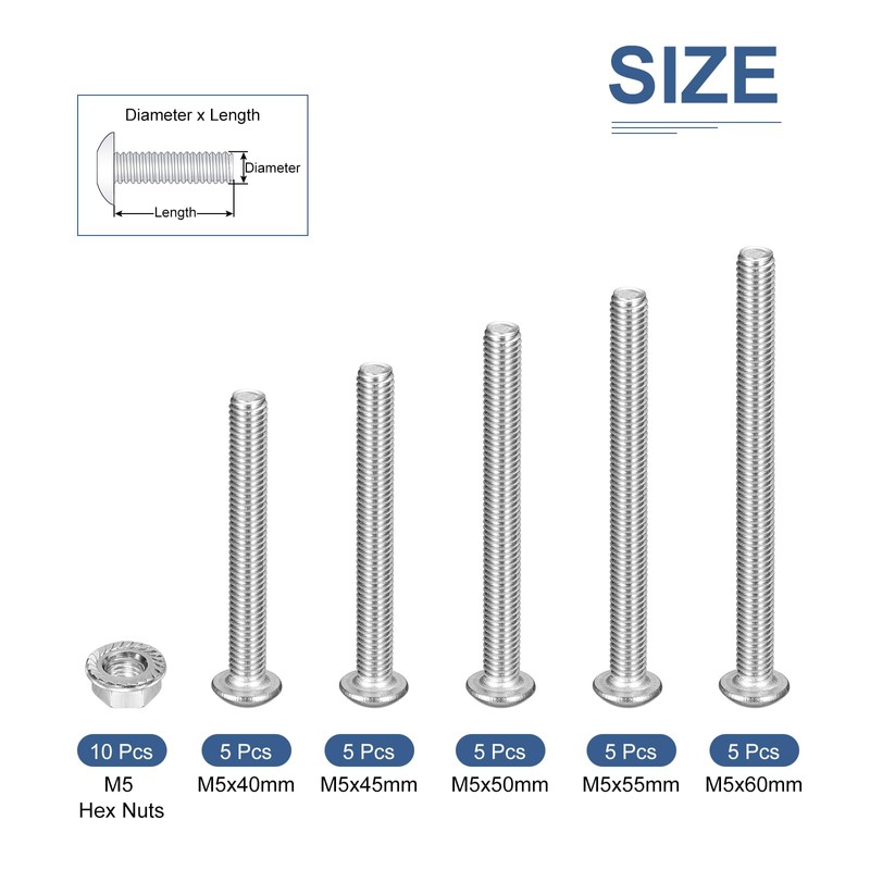 - [Inner Hex Socket Screw Kit]: The package comes with 35 Pcs of full thread Button Head Socket Screws Nuts Assortment Kit: Screws - 5pcs x M5-0.8x40mm,5pcs x M5-0.8x45mm,5pcs x M5-0.8x50mm,5pcs x M5-0.8x55mm,5pcs x M5-0.8x60mm. Hex Flange Nuts - 10pcs x M5-0.8.