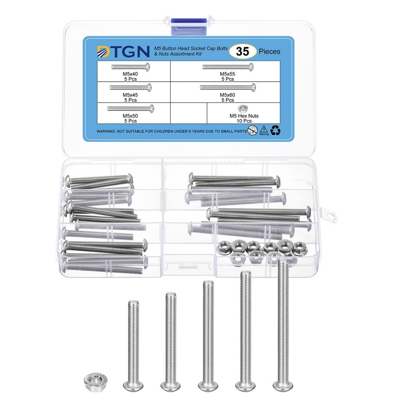 DTGN 35Pack M5(D) Button Head Socket Cap Screws Nuts Kit - 40/45/50/55/60mm(L) Hex Socket Cap Bolt Nut Assortment - 304 Stainless Steel Full Thread - Good for Machine
