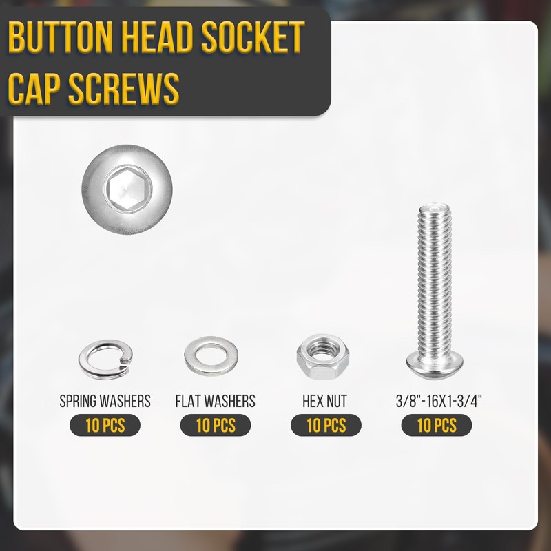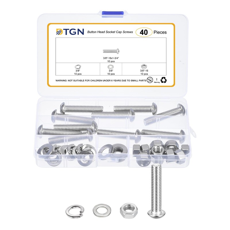 - [Button Hex Socket Screw Nut Assortment Kit]: The package comes with 40pcs 3/8"-16x1-3/4" Button Hex Socket Cap Screw Assortment Kit & Hex Nut & Washer; The quantity is sufficient and the size is rich to meet your needs on different occasions.
