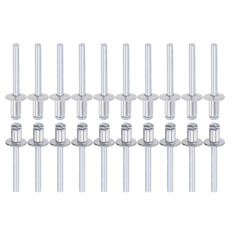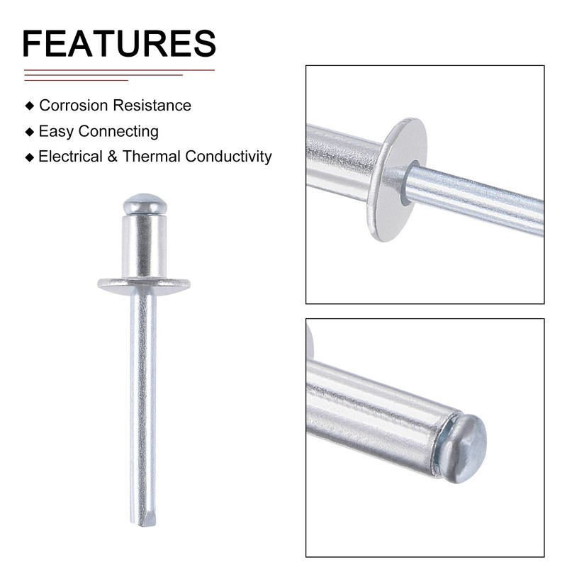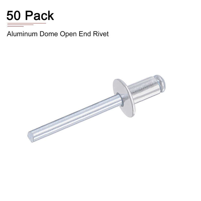 - [Blind Rivets]: The package comes with 50pcs of silver tone open end blind rivets in 6mm/0.24" rivet dia., 10mm/0.39" grip length, 12mm x 2.5mm/0.47" x 0.10"(Dia*T) flange size.