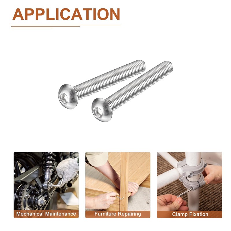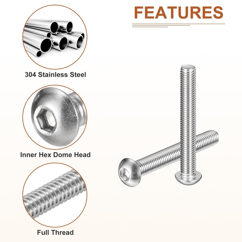 - [Design]: The button socket head cap screw is designed with an inner hex drive style and dome head, providing a higher torque and clamping force, as well as offering a wider bearing surface and high tensile strength.