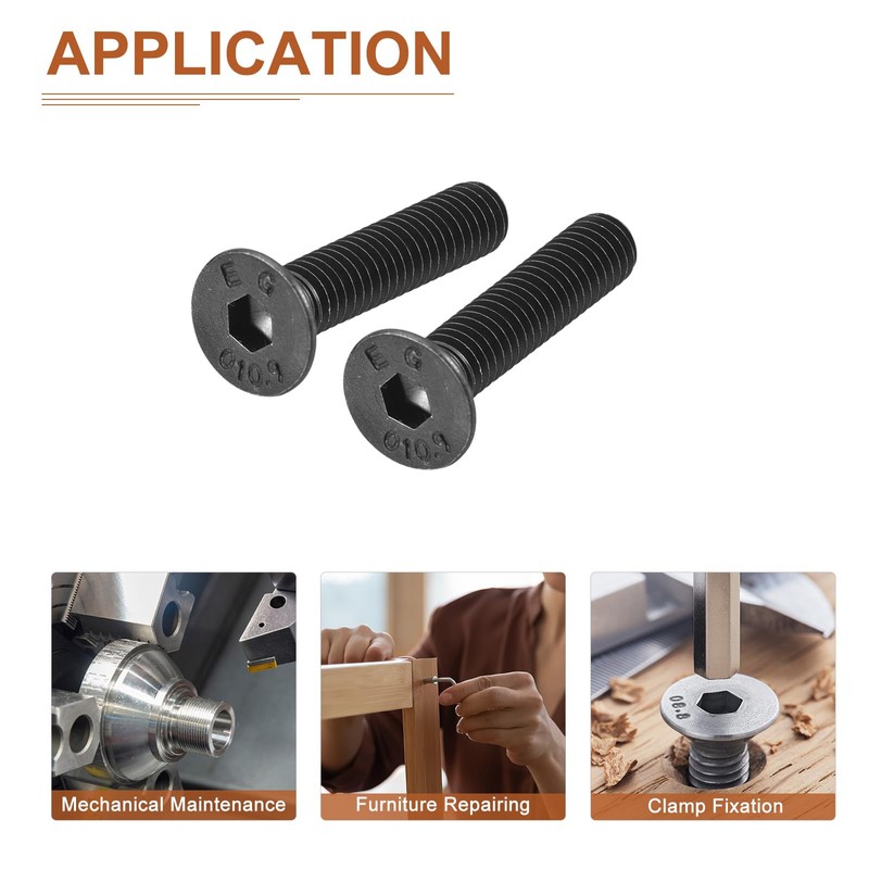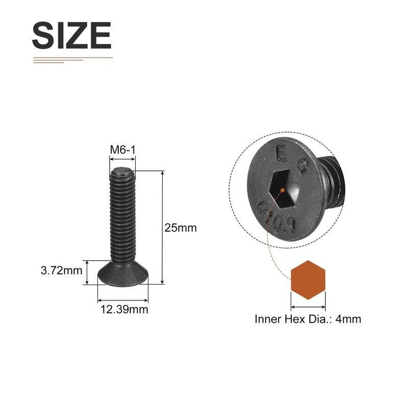 - [Socket Head Screws]: The package comes with 50pcs of Hex Socket Flat Head Screws. Model: M6-1x25mm; Screw Groove Type: Inner Hex; Hex Dia.: 25mm;