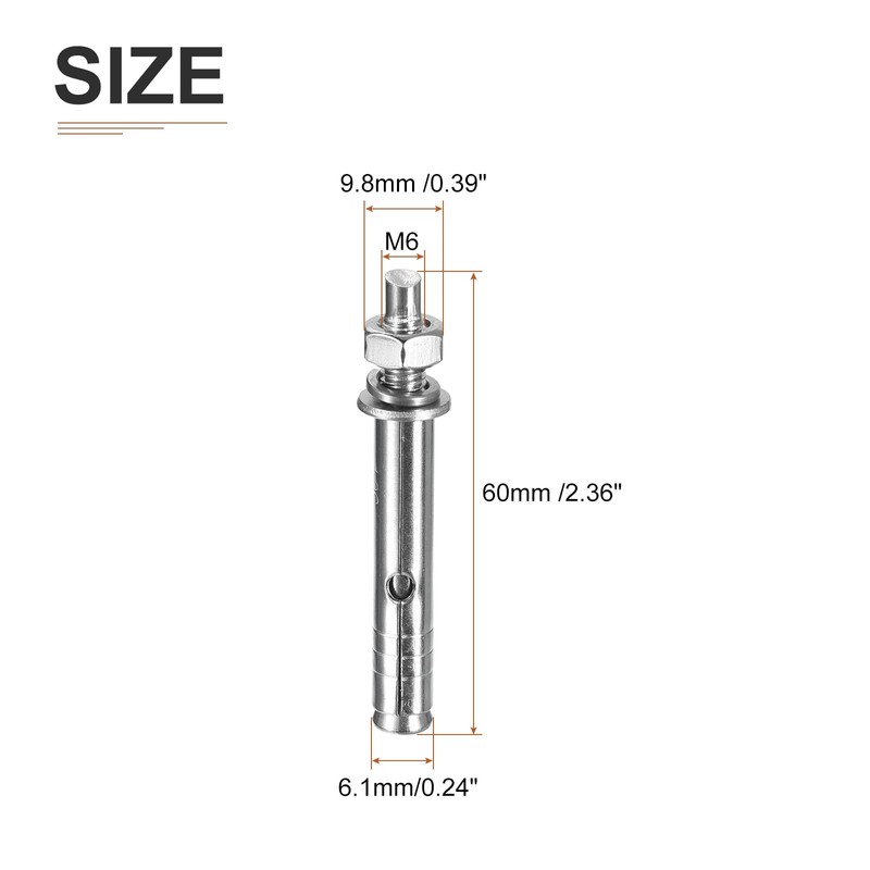 - Expansion Bolts - The package comes with 12pcs of silver 304 stainless steel expansion bolts in nut size M6 x 60mm, thread diameter: 6mm/0.24inch, total length: 60mm /2.36inch, nut size: 9.8 x 4.8mm/0.39 x 0.19inch(across flats D*T), pre-drilled hole diameter: 6.1mm / 0.24inch, installation torque: 5Ft/Lbs, gasket size: 6.5 x 11.8 x 1.4mm / 0.26 x 0.46 x 0.06inch (ID*OD*T).