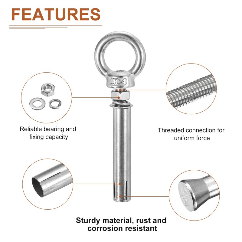 - [Expansion Eye Bolts] - The package comes with 5pcs of silver 304 stainless steel expansion bolts in nut size M6 x 70, thread diameter: 6mm/0.24", total length: 70mm/2.76", nut size: 10.8x5.5mm/0.43x0.22" (Across Flats D*T), pre-drilled hole diameter: 16", installation torque: 5Ft/Lbs.